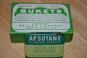 Later products of the 1930s and 40s illuminate the continuing importance of herbal products in the lives of Americans during and after the Great Depression, but also act as harbingers of coming change. This was a time of economic hardship when many people could not afford physician’s fees and self-care skills continued to be of great value. Remedies including Argotane, Bukets, and Califig still used herbal terms on their labels such as tonic, cholagogue, and elixir or phrases such as “stimulant to the diuretic action of the kidneys”. Some products like Sterling Drug’s Califig syrup continued on in the traditions of the past by offering an herbal remedy containing Senna, Cassia, Cloves, and Peppermint for the treatment of constipation. However, businesses such as the Argotane Company (a division of Plough Inc.) were bridging the past and future with new formulas and promotional tactics. Argotane frequently ran ads in newspapers across the country extolling the virtues of their product. These ads were disguised as news articles with titles and subtitles such as “Mrs. Hays One of the Proudest Women in Amarillo, Texas, I?m Certainly Grateful For the Happiness Arogtane Has Brought Home”.2 Product formulas of this era highlight a new layer of our herbal heritage that is beginning to unfold, which is the coming transition away from whole herbal ingredients and the increasing preference for isolated chemical compounds as medicines. Argotane’s laxative formula includes staples of the past along with hints of the future: Nux vomica, Cascara Sagrada, and Capsicum are combined with laboratory compounds such as Phenolphthalein, which served as a laxative but has more recently raised concerns as a likely carcinogen.3 Keller Company’s Bukets formula for urinary health also exemplifies this new standard of medicine by combining the herbs Buchu, Juniper berries, Asparagus extract, Saw Palmetto berries, and Scotchbroom along with chemical compounds for dissolving urinary stones and reducing urinary inflammations such as lithium carbonate and potassium nitrate. This movement toward faith in chemicals would ultimately gain momentum and become the prevailing view in our country by mid-century.