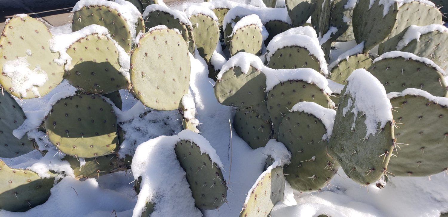 Nopal / Prickly Pear pads in snow, photo by Christiana Magdalena Hopkinson